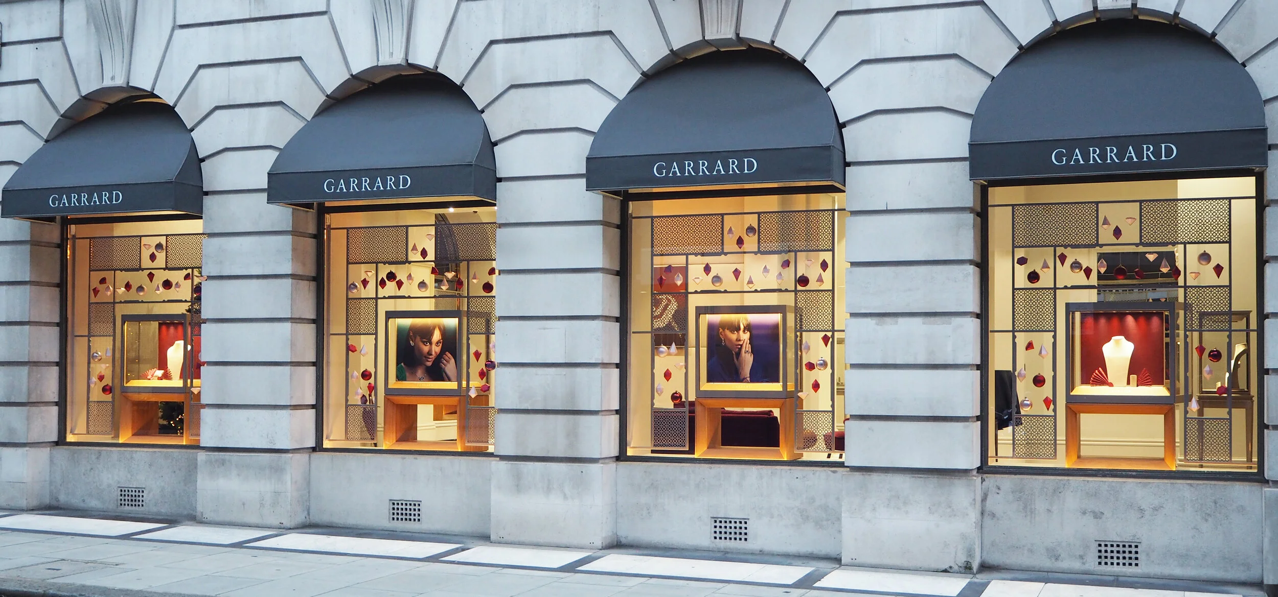 Inspired by the Garrard fine jewellery collections, HWVisual designed, produced and installed a range of festive faceted paper jewels in the open-backed windows of the House of Garrard flagship store, London. Visible from both the exterior and interior of the boutique, the pearlised jewels spun gently on their axes to catch the eye of passers by.